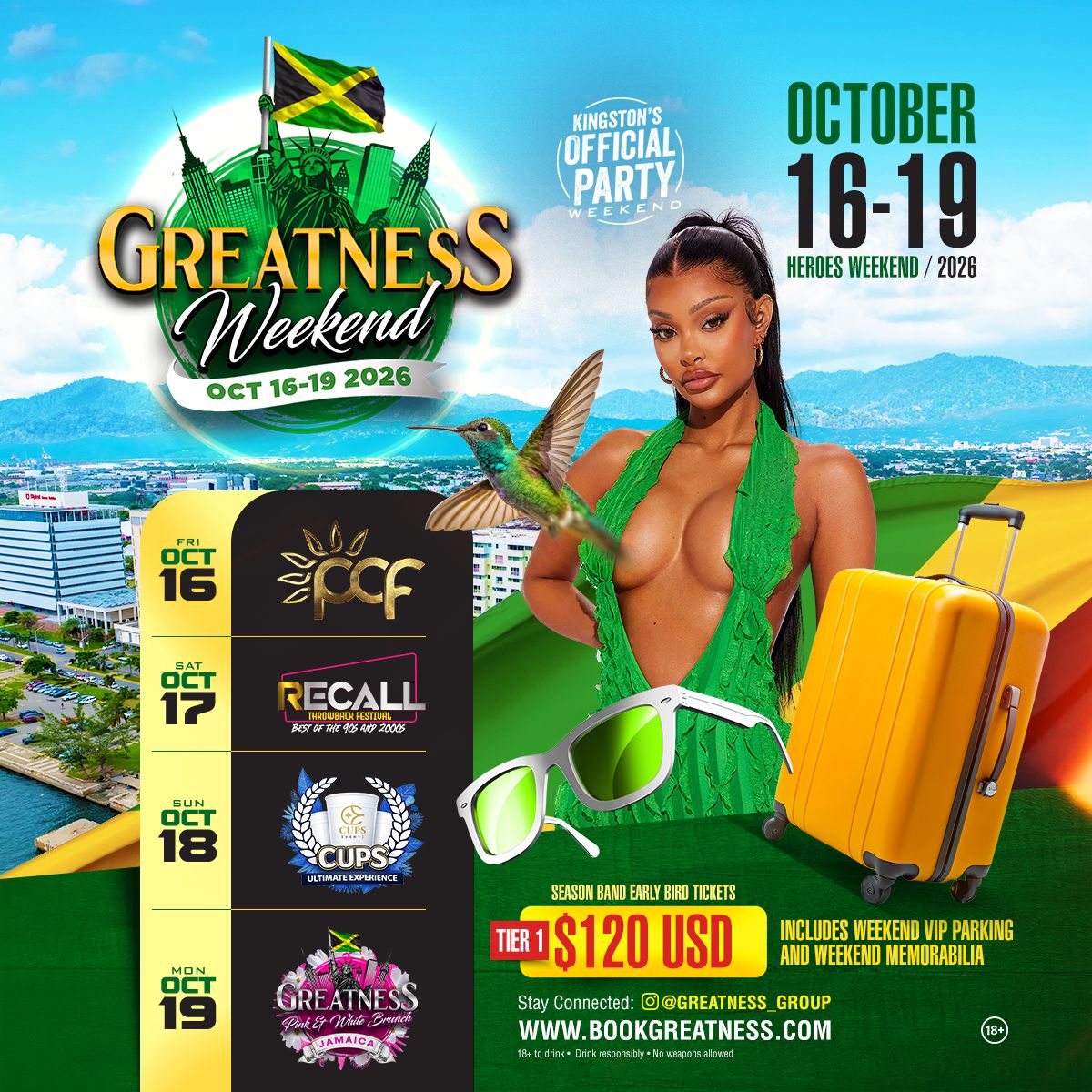 Greatness Weekend is Kingston, Jamaica’s official Heroes Weekend entertainment series, delivering a four-day, multi-event experience delivering a curated four-day lineup of signature events—PCF: Pool Cooler Fete, Recall: Throwback Festival, CUPS: Premium Blue & White Event, and the Greatness Pink & White Brunch from October 16–19, 2026.
