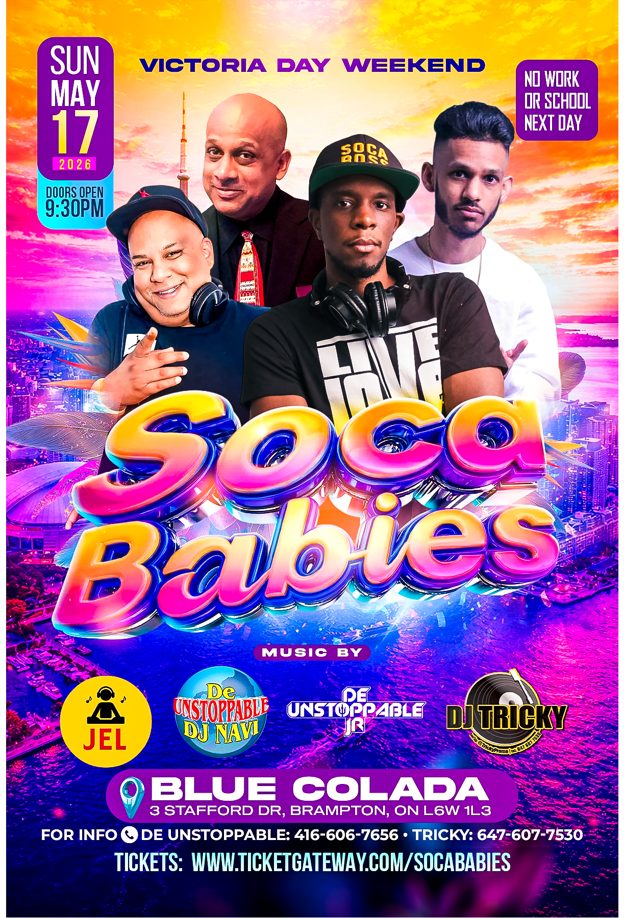 Sunday May 17th, 2026 “ SOCA BABIES ” "Giving you a taste of Trinidad carnival" Inside: BLUE COLADA REST 3 Stafford Dr. Brampton (At Strafford Drive, & Kennedy Rd) Featuring a deejay cast: * dj JEL - international. 1st ever westend appearance * de UNSTOPPABLE - T.O's iconic dj * TRICKY - T.O's versatile Bottle Service highly recommended: $180 cash specials before midnight * Hennessy & Johnnie Walker Calling all celebrations: Birthdays, Anniversaries, Girls Nite out, etc… For limited early bird $10 ladies tickets, visit https://www.ticketgateway.com/event/view/socababies For reservations or group bookings, contact: * de Unstoppable at 416 606 7656 * Tricky at 647 607 7530 Doors open at 9:30pm. R.O.A.R / Strict Security / 19+ / Free parking. Mandatory admission for all inside venue after 9:30pm.