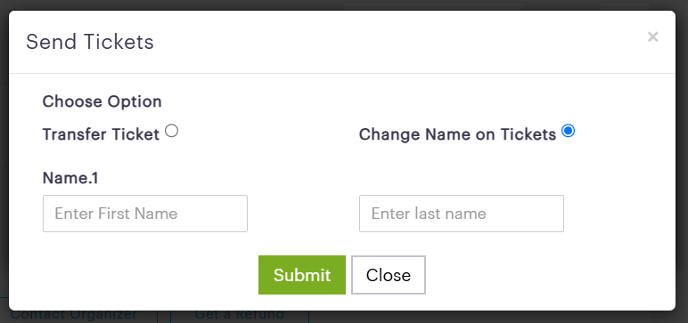 • Select the highlighted option to change name on your tickets, Enter first and last name and submit.