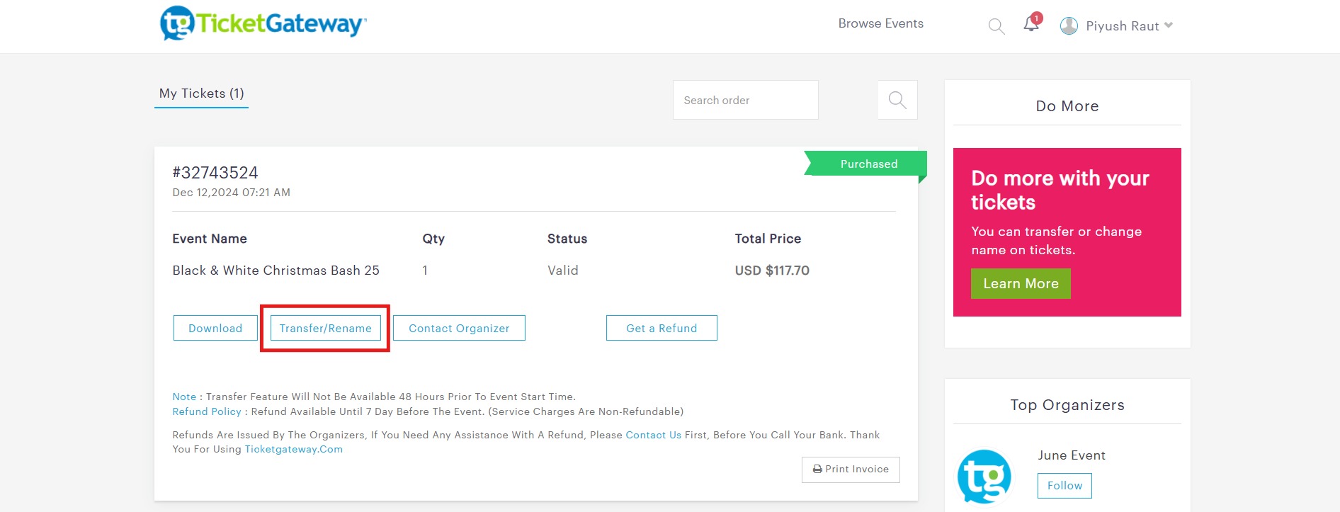 Note : Transfer feature will not be available 48 hours prior to event start time.