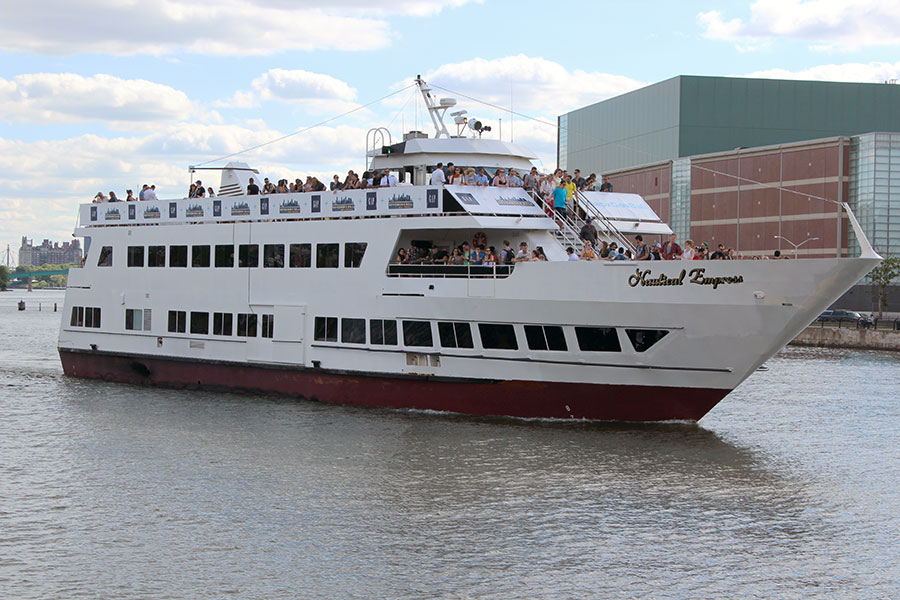The Nautical Empress is the largest member of our stellar fleet. This luxurious and modern boat can accommodate up to 600 passengers and seat up to 150. There are two levels of spacious indoor decks as well as a massive outdoor deck on the third level. This vessel offers full-sized bars, a large dance floor, and luxurious amenities. A New York City cruise aboard the Nautical Empress is an extraordinary sightseeing experience for guests of all ages.